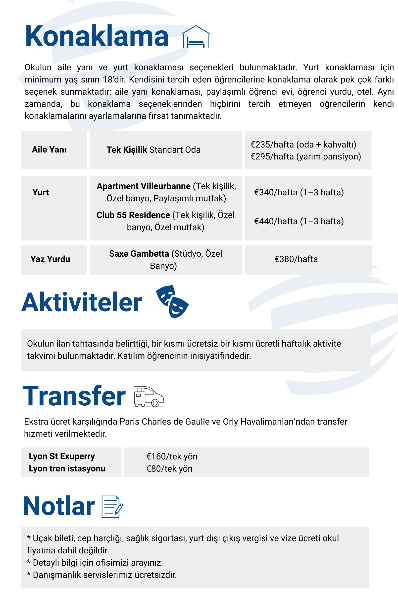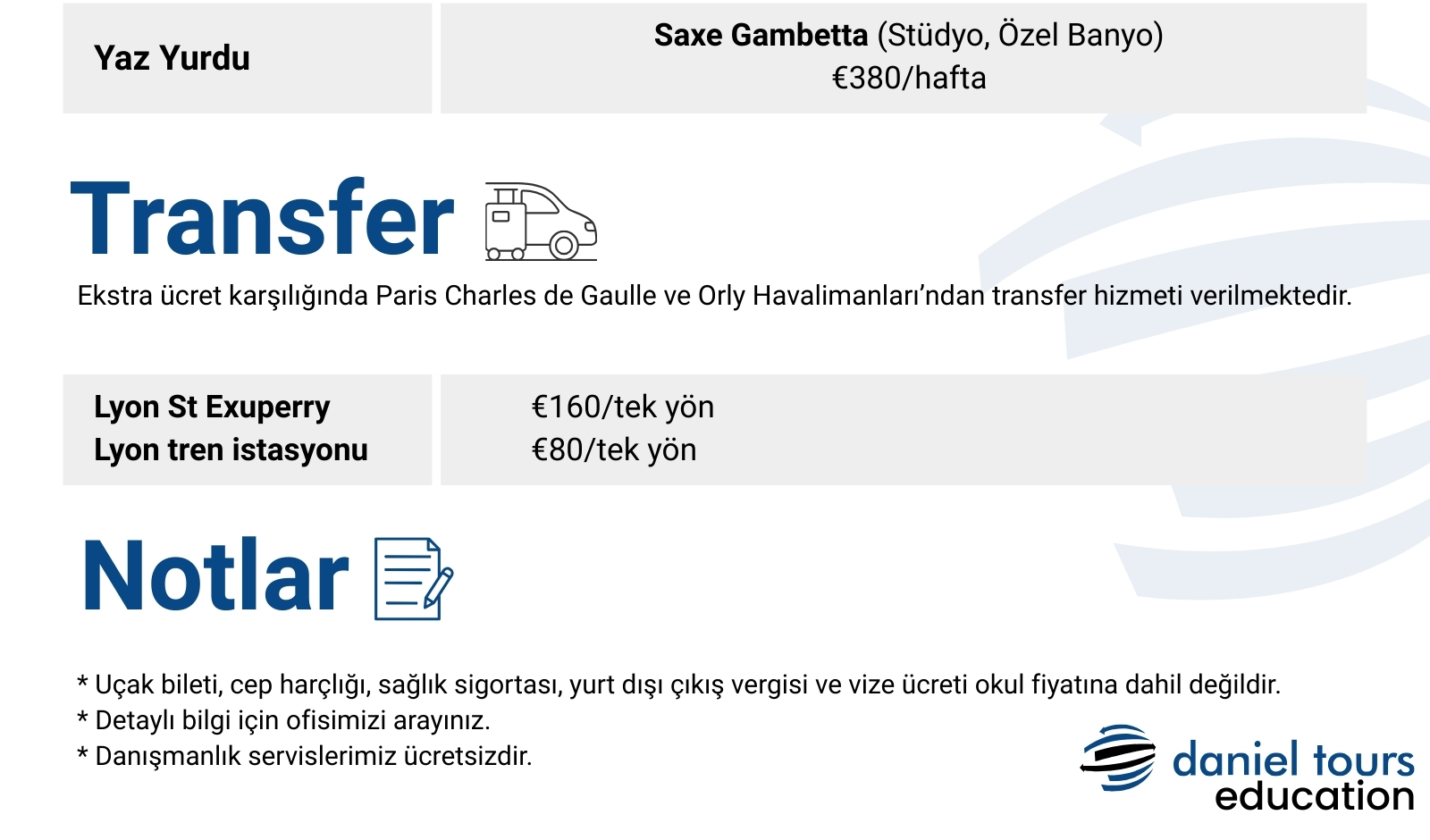 (a) Başvuru Ücreti (CHF/€ 825) (b) Üniversite Yerleştirme Ücreti (CHF/€ 500) (c) İade edilmeyen herhangi bir Sigorta Ücreti (d) İdari Ücret (CHF 165 veya € 110) (e) Kurye Ücreti (CHF 120 veya € 90) (f) Banka Masrafları (CHF 45 veya € 40) (g) Transfer Ücretleri