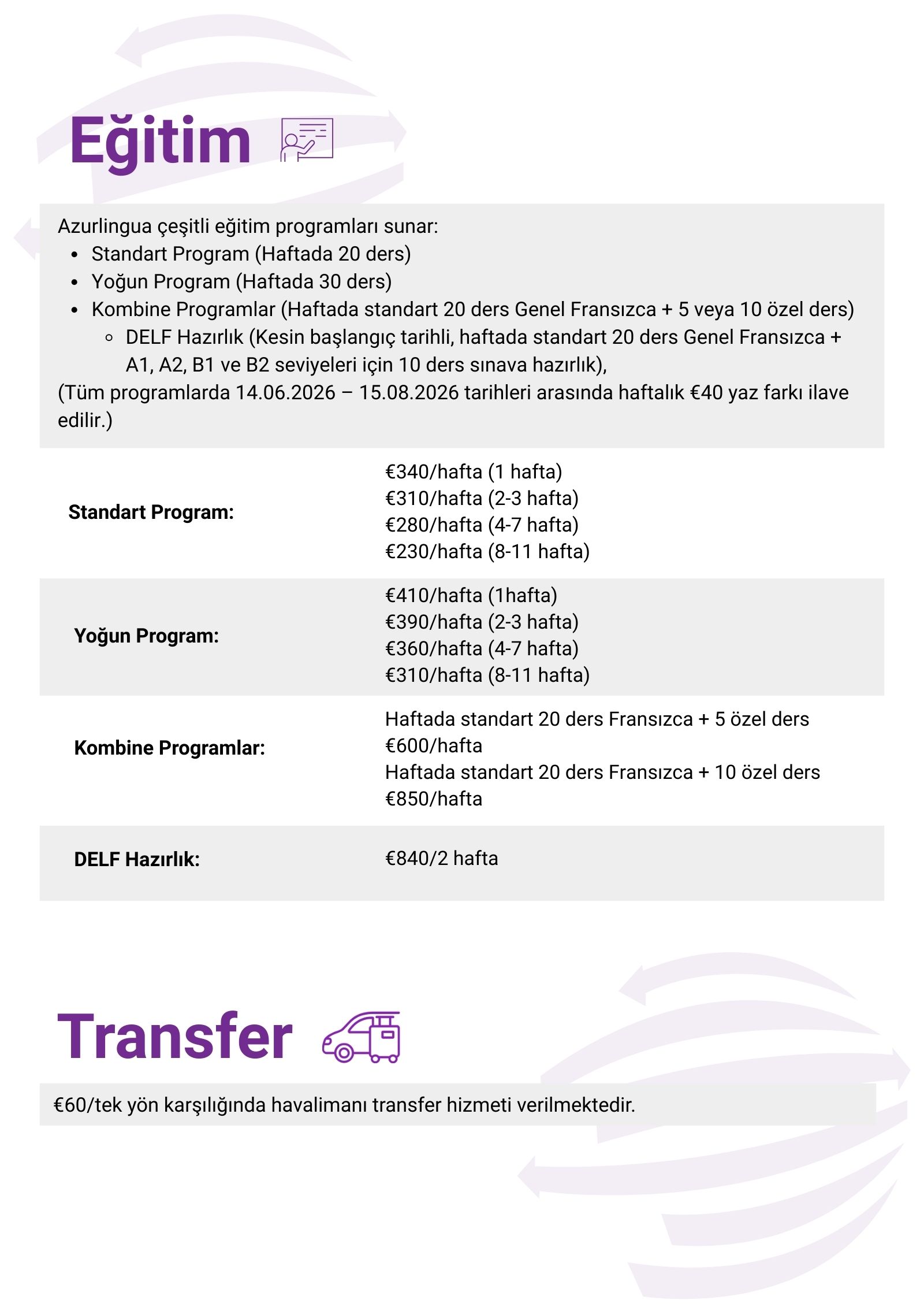 Standart Program,Yoğun Program ,Kombine Programlar ,Mesleki Fransızca,DELF Hazırlık