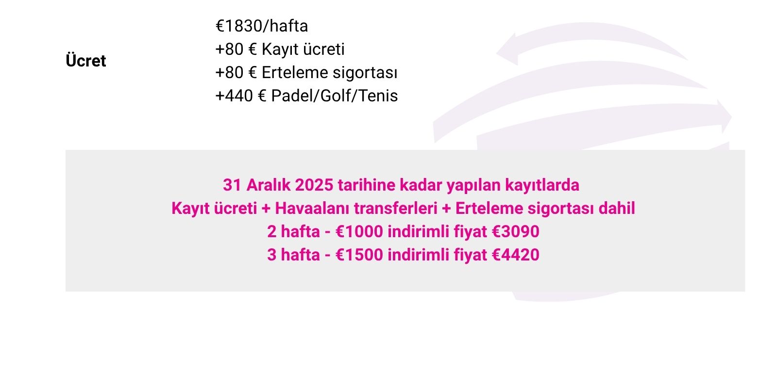 Dersin başlamasından 24 saatten (iş günü) daha az süre önce iptal edilmesi durumunda, ders iptal edilir ve ücret iadesi yapılmaz.
