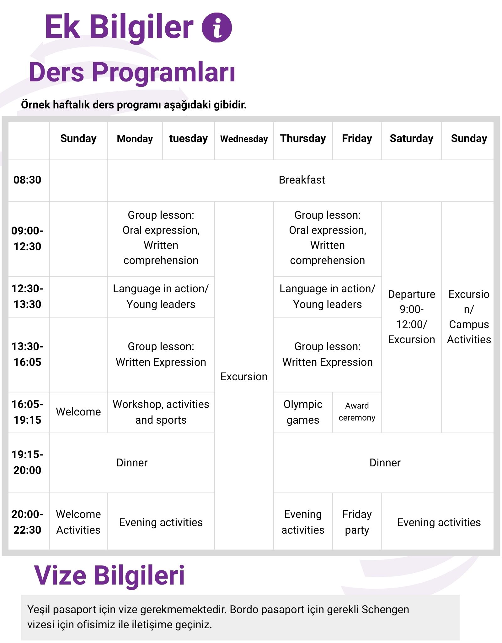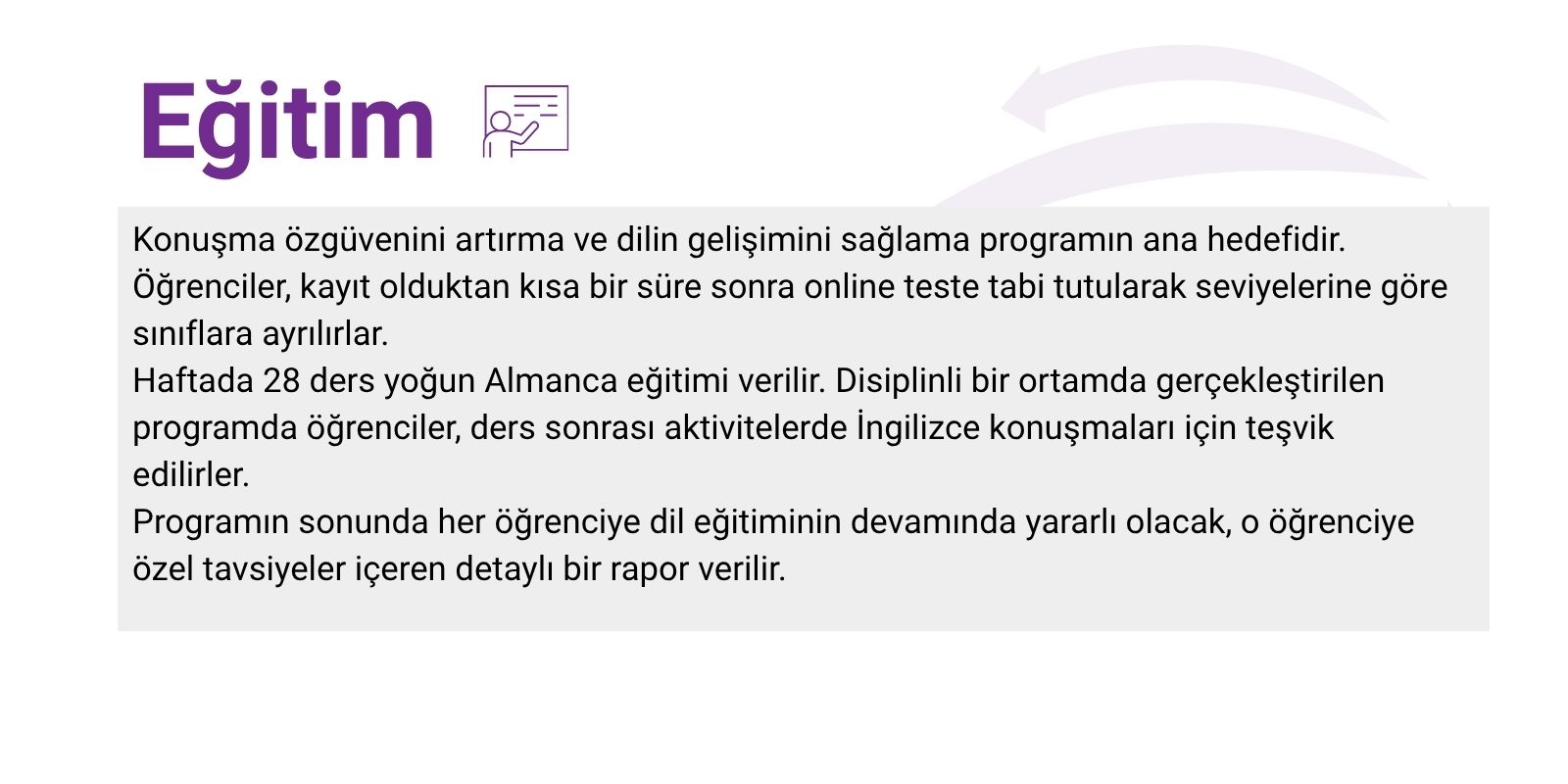 Yazılı olarak bildirilen iptal veya ertelemelerin, konaklamalı dil eğitiminin, konaklamasız dil eğitiminin (haftada en az 20 saat) veya kültürlerarası eğitimin başlangıcından 21 günden daha az bir süre önce yapılması durumunda, müşteriden fatura tutarının %30’una denk gelen sabit bir iptal ücreti tahsil edilir.