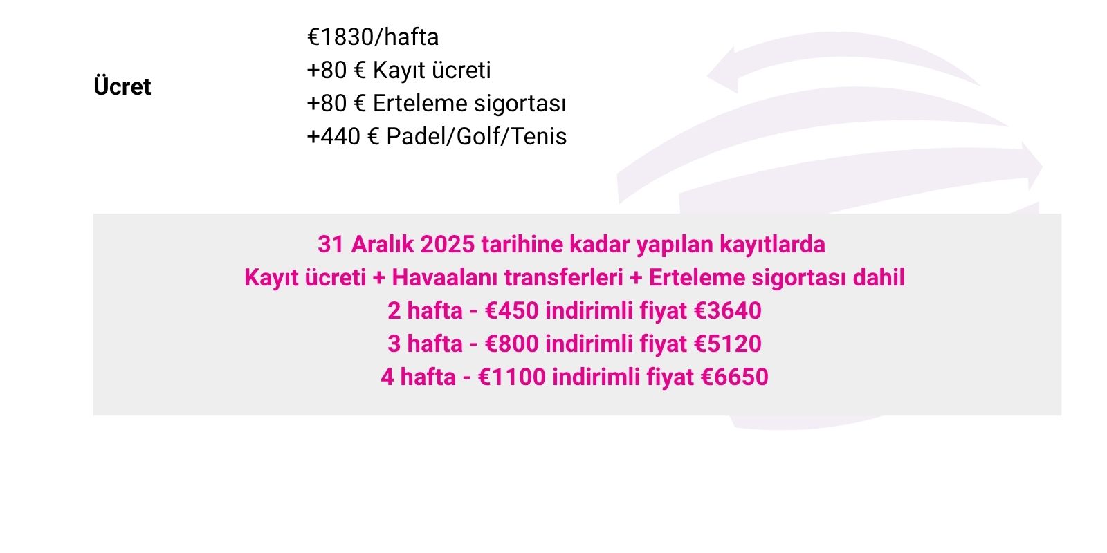 Her paket için bir oturumun ertelenmesine izin verilir; ancak yazılı talebin oturumdan en az 2 iş günü önce Müşteri Hizmetleri Departmanımıza ulaşması gerekir.