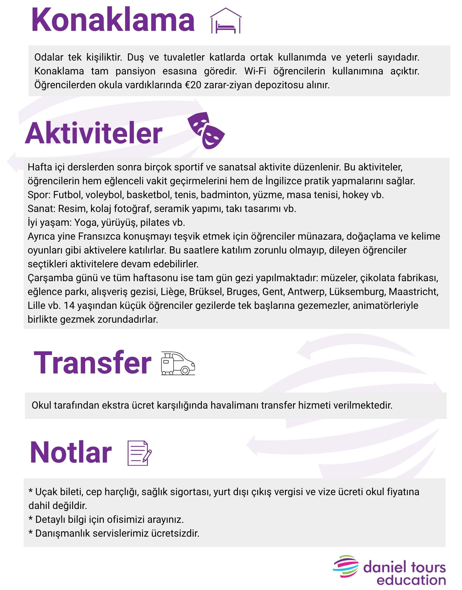 Yazılı olarak bildirilen iptal veya ertelemelerin, konaklamalı dil eğitiminin, konaklamasız dil eğitiminin (haftada en az 20 saat) veya kültürlerarası eğitimin başlangıcından 21 günden daha az bir süre önce yapılması durumunda, müşteriden fatura tutarının %30’una denk gelen sabit bir iptal ücreti tahsil edilir.