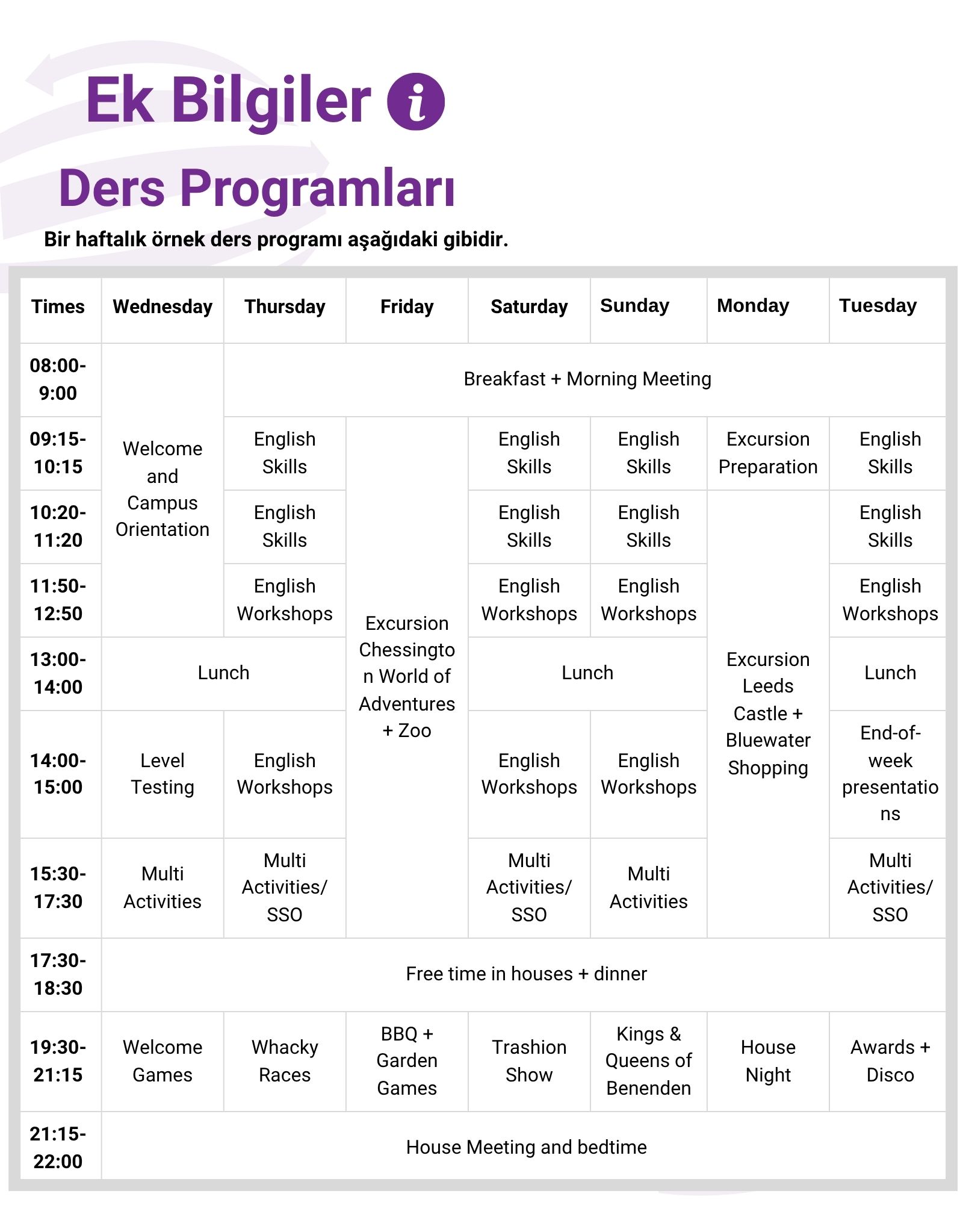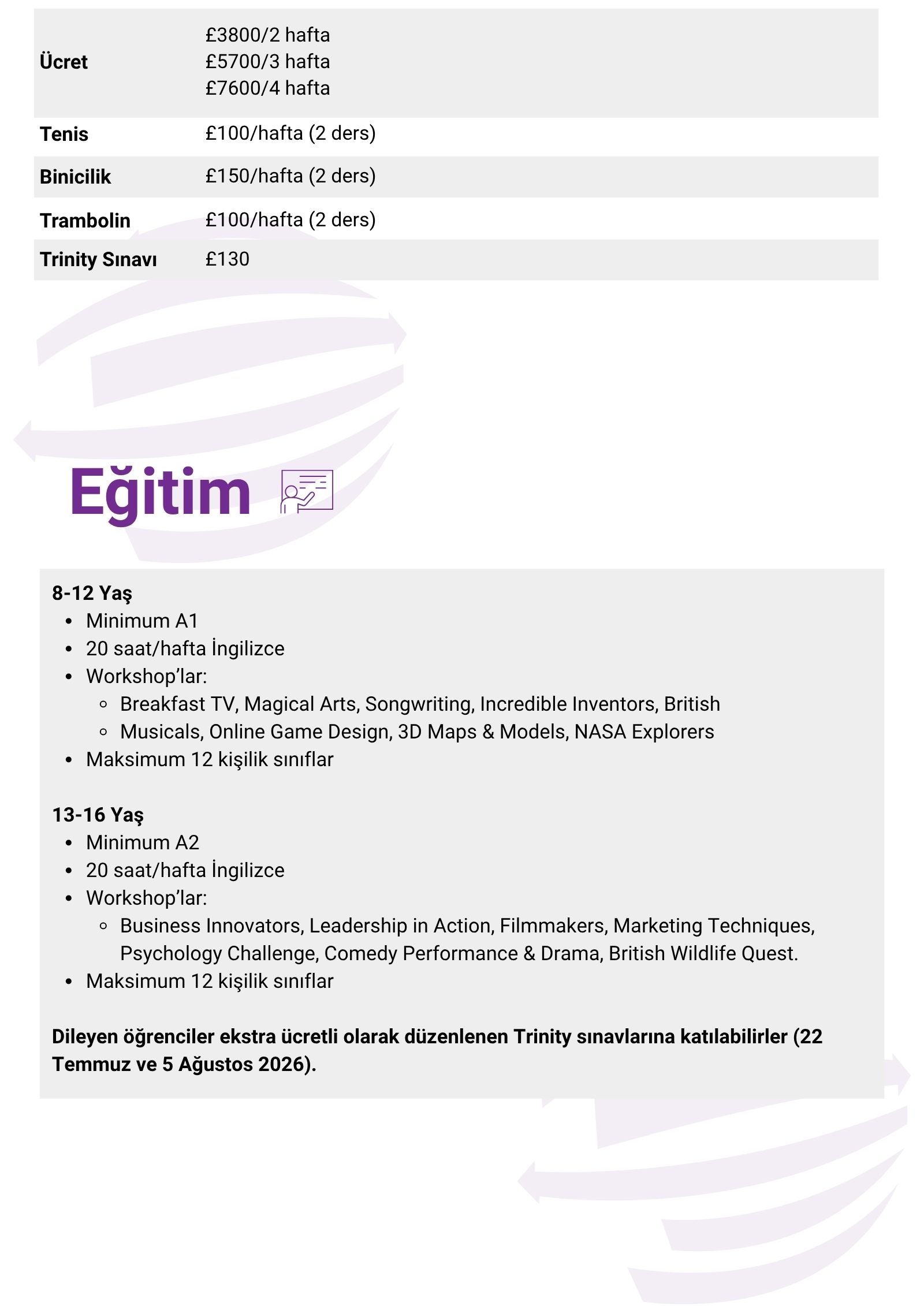 10 Temmuz – 24 Temmuz 2026 / 17 Temmuz – 31 Temmuz 2026 / 24 Temmuz – 7 Ağustos 2026 (2 hafta) 10 Temmuz – 31 Temmuz 2026 / 17 Temmuz – 7 Ağustos 2026 (3 hafta) 10 Temmuz – 7 Ağustos 2026 (4 hafta)