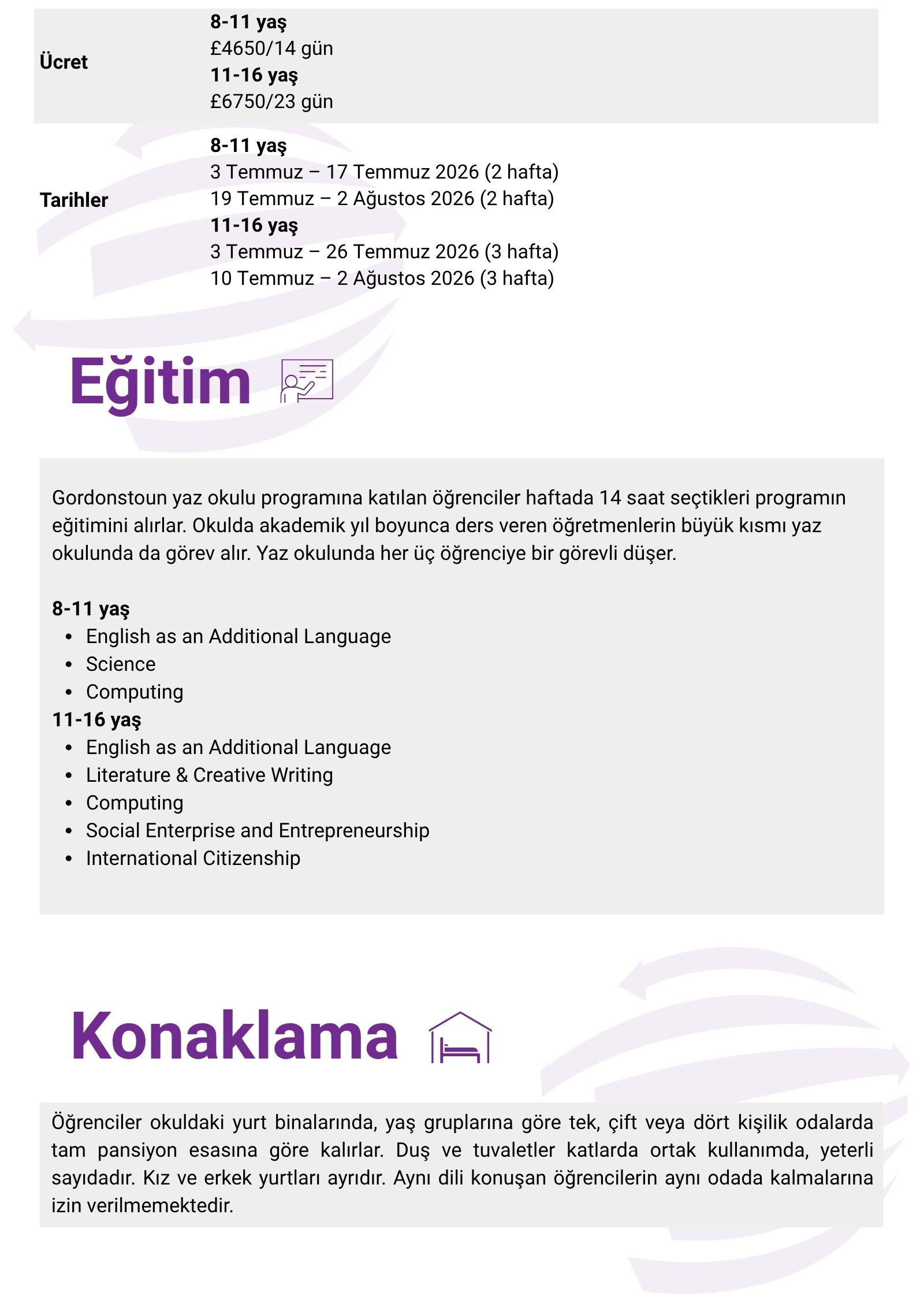 8-11 yaş 3 Temmuz – 17 Temmuz 2026 (2 hafta) 19 Temmuz – 2 Ağustos 2026 (2 hafta) 11-16 yaş 3 Temmuz – 26 Temmuz 2026 (3 hafta) 10 Temmuz – 2 Ağustos 2026 (3 hafta)