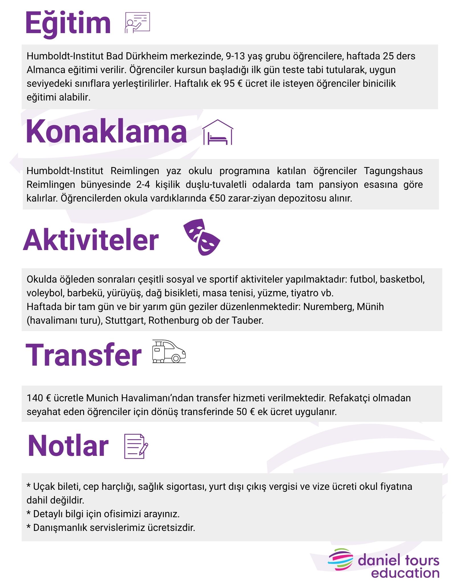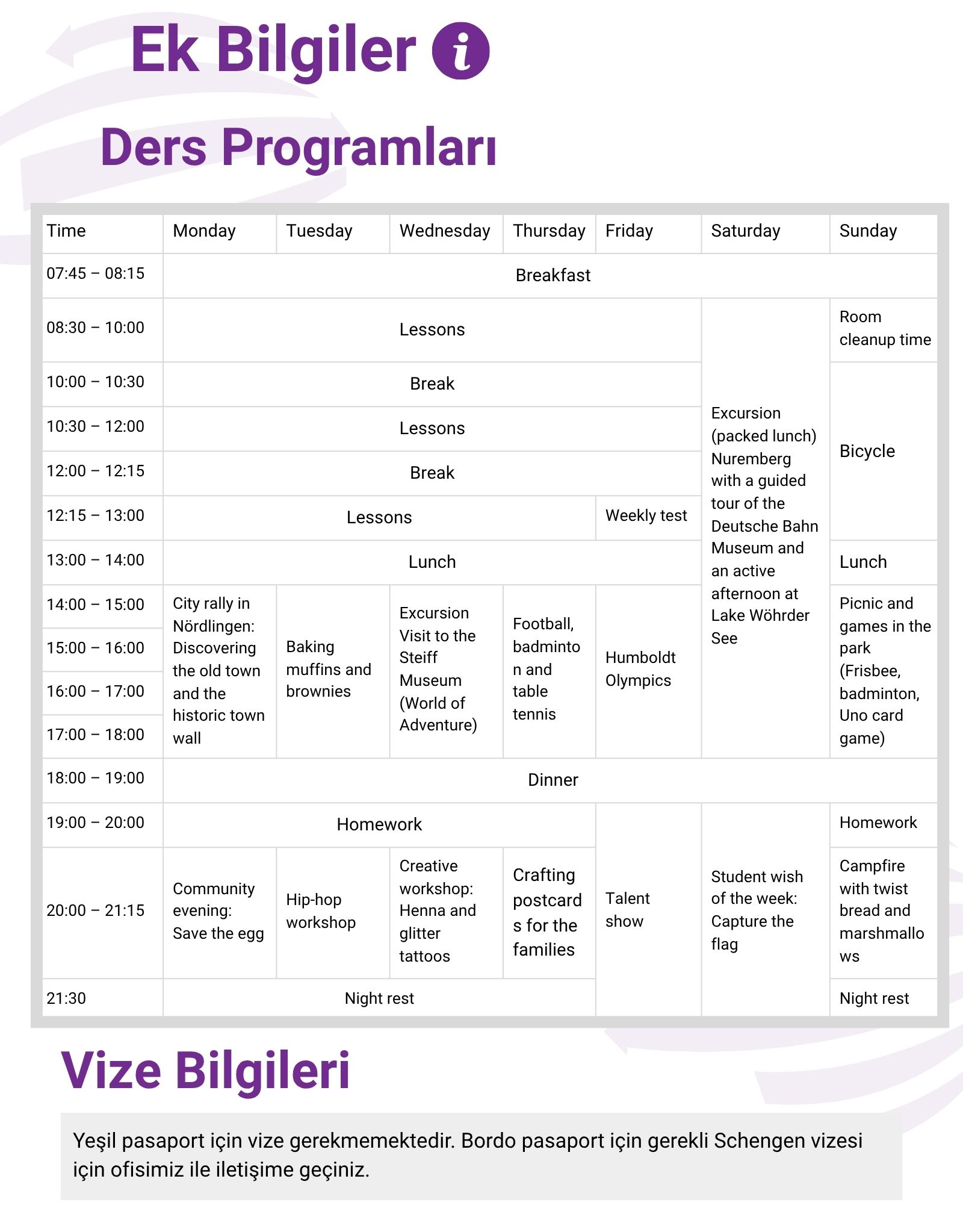 Rezerve edilmiş bir kursun uzatılması ücretsiz olarak mümkündür. Bir kursun kısaltılması veya yeniden rezervasyonu, kurs başlangıcından 14 gün öncesine kadar 50 € işlem ücreti karşılığında mümkündür. Bu tarihten sonra iptal koşulları geçerlidir.