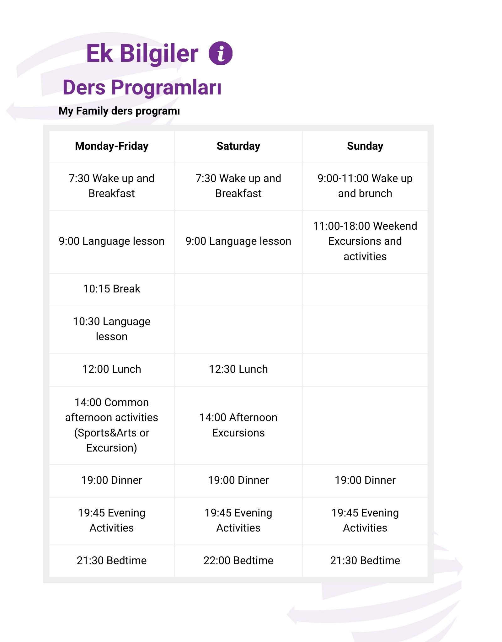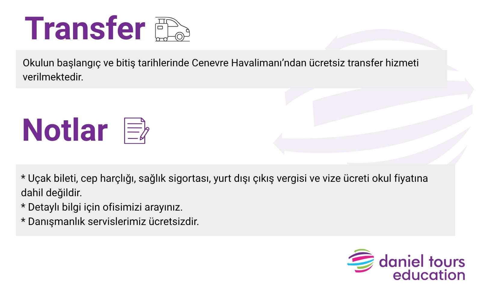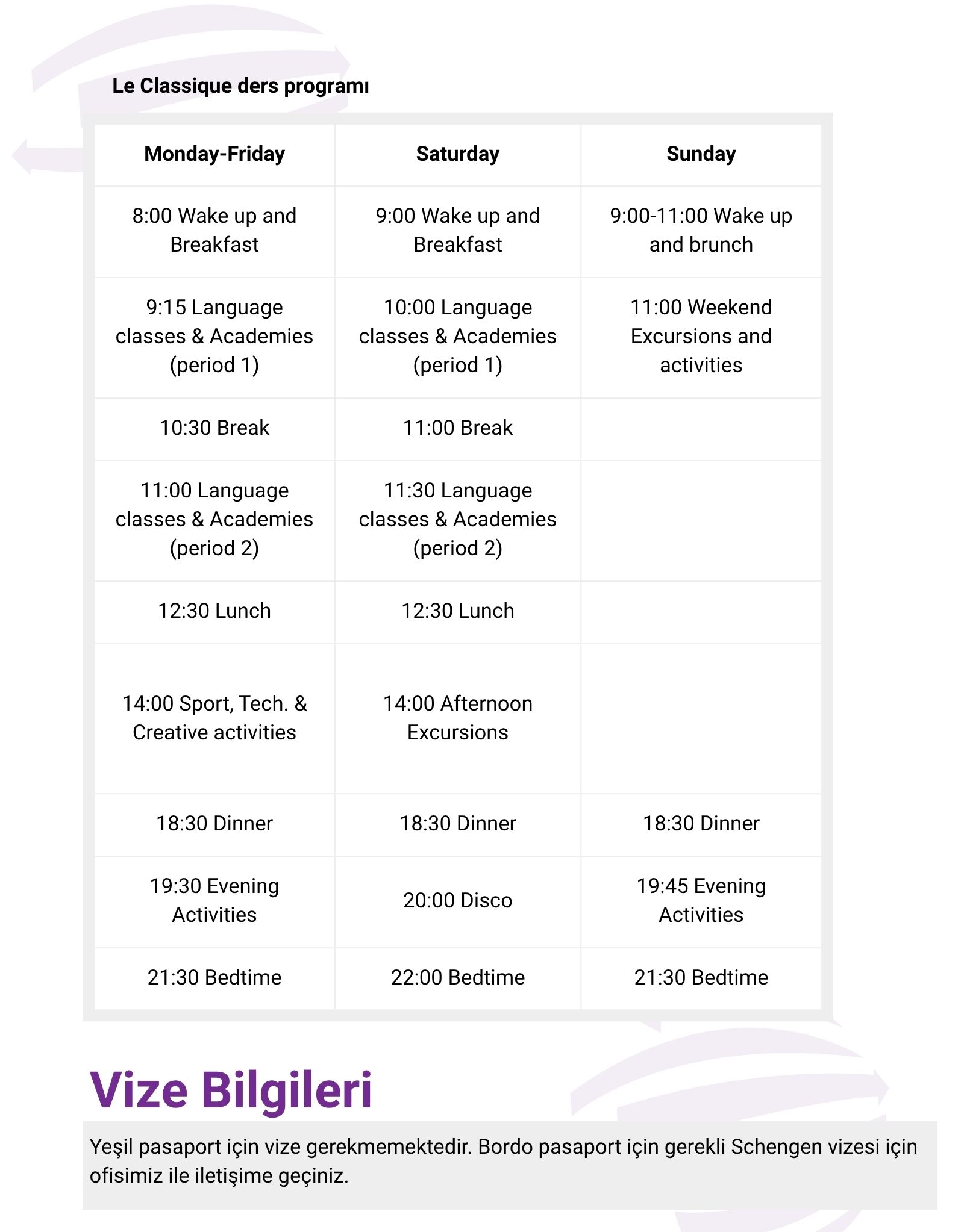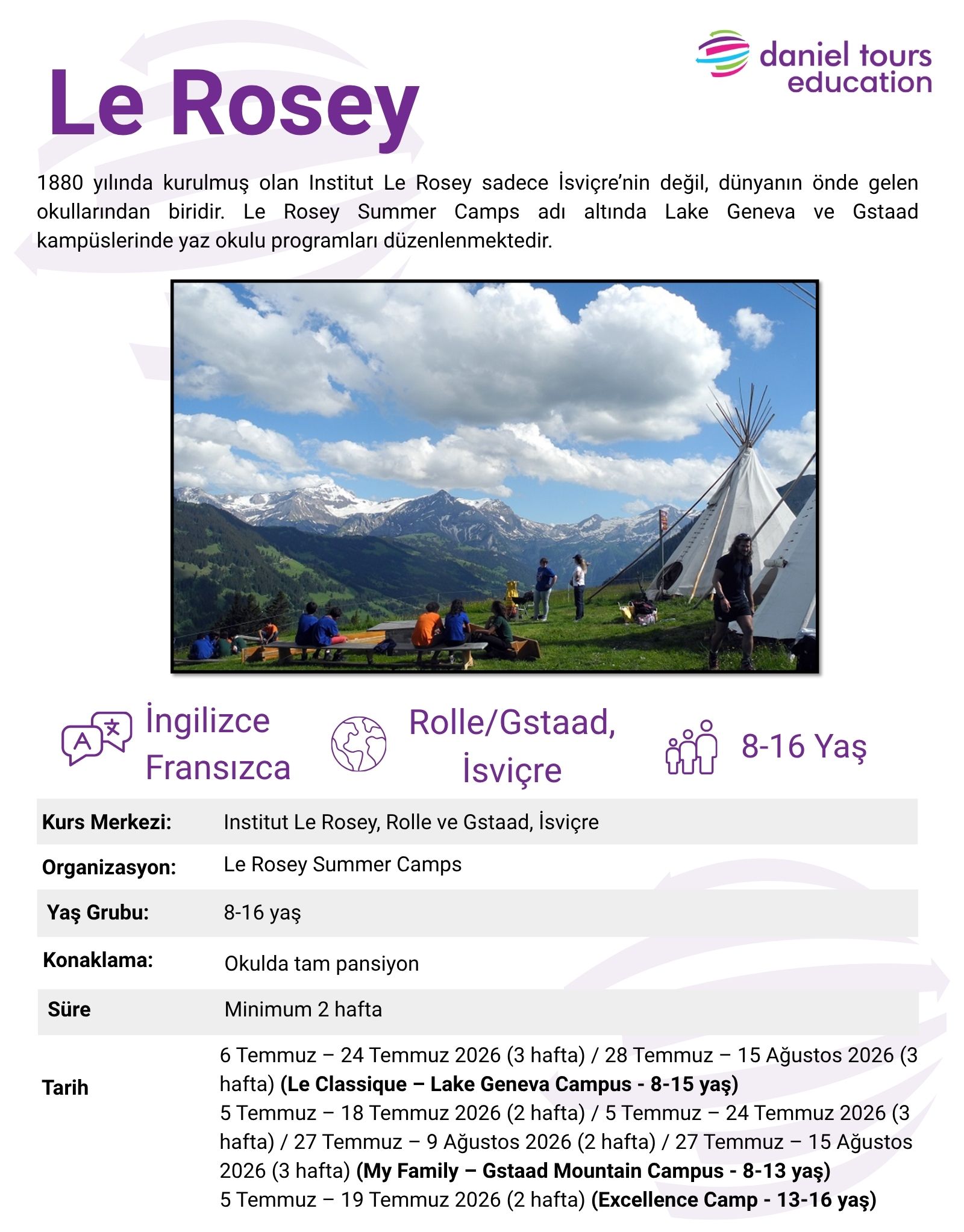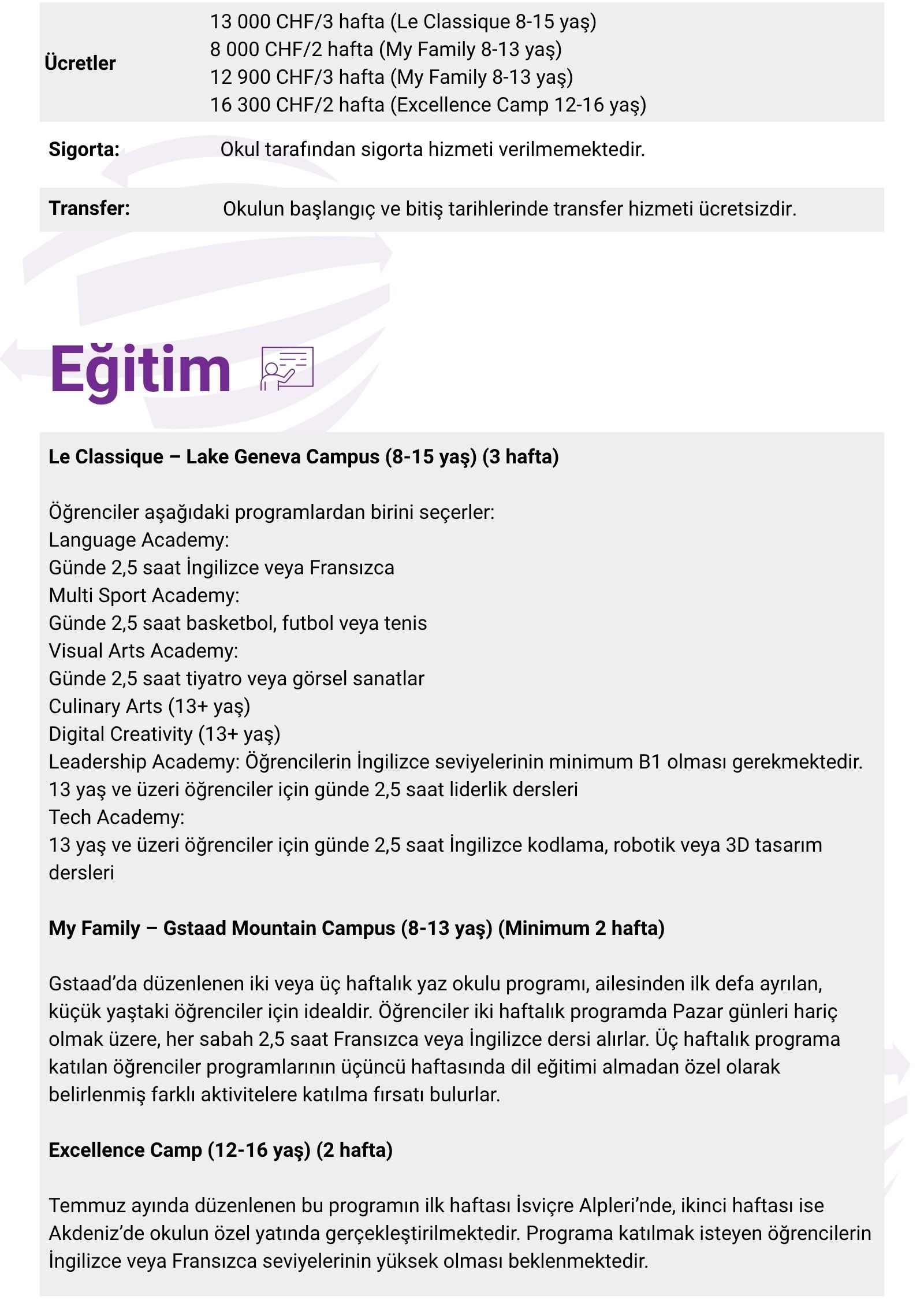 6 Temmuz – 24 Temmuz 2026 (3 hafta) / 28 Temmuz – 15 Ağustos 2026 (3 hafta) (Le Classique – Lake Geneva Campus - 8-15 yaş) 5 Temmuz – 18 Temmuz 2026 (2 hafta) / 5 Temmuz – 24 Temmuz 2026 (3 hafta) / 27 Temmuz – 9 Ağustos 2026 (2 hafta) / 27 Temmuz – 15 Ağustos 2026 (3 hafta) (My Family – Gstaad Mountain Campus - 8-13 yaş) 5 Temmuz – 19 Temmuz 2026 (2 hafta) (Excellence Camp - 13-16 yaş)