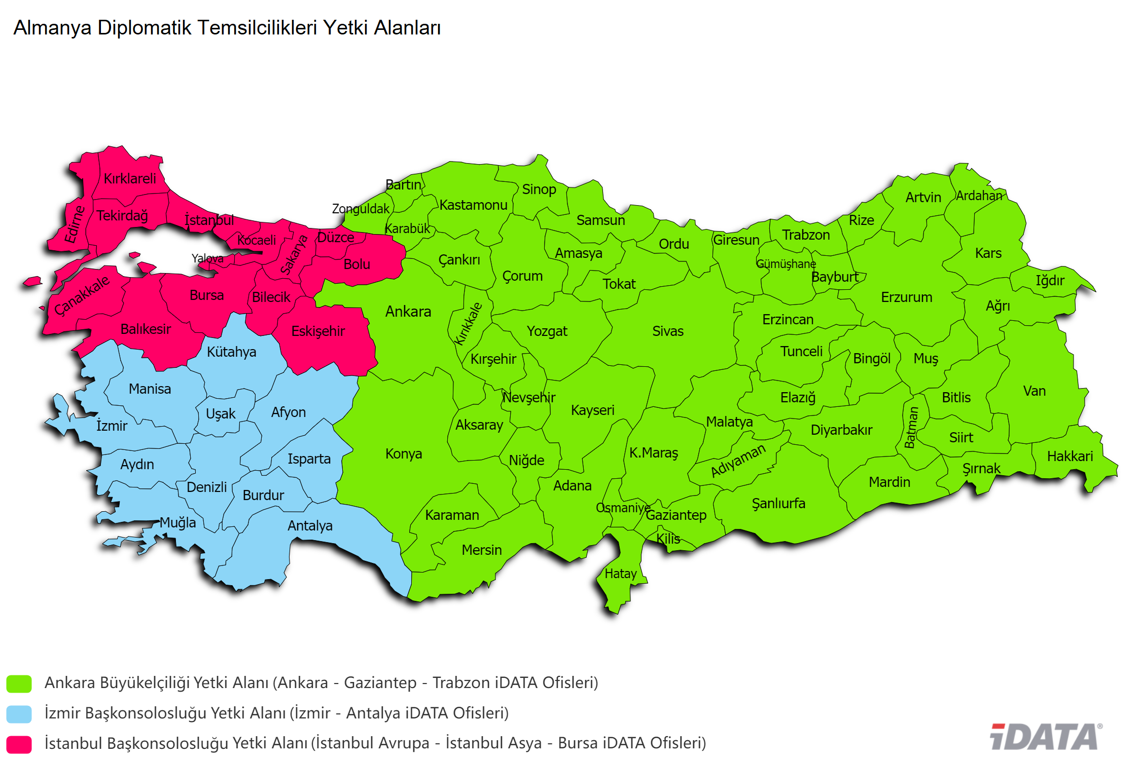 Bölge ayrımı ve başvuru ofislerine ait bilgiyi aşağıdaki haritadan ve daha fazla bilgi için yetkili aracı kurum İdata Başvuru Ofisleri bağlantısı üzerinden (https://www.idata.com.tr/de/tr/p/basvuru-ofisleri-de) ulaşabilirsiniz.
