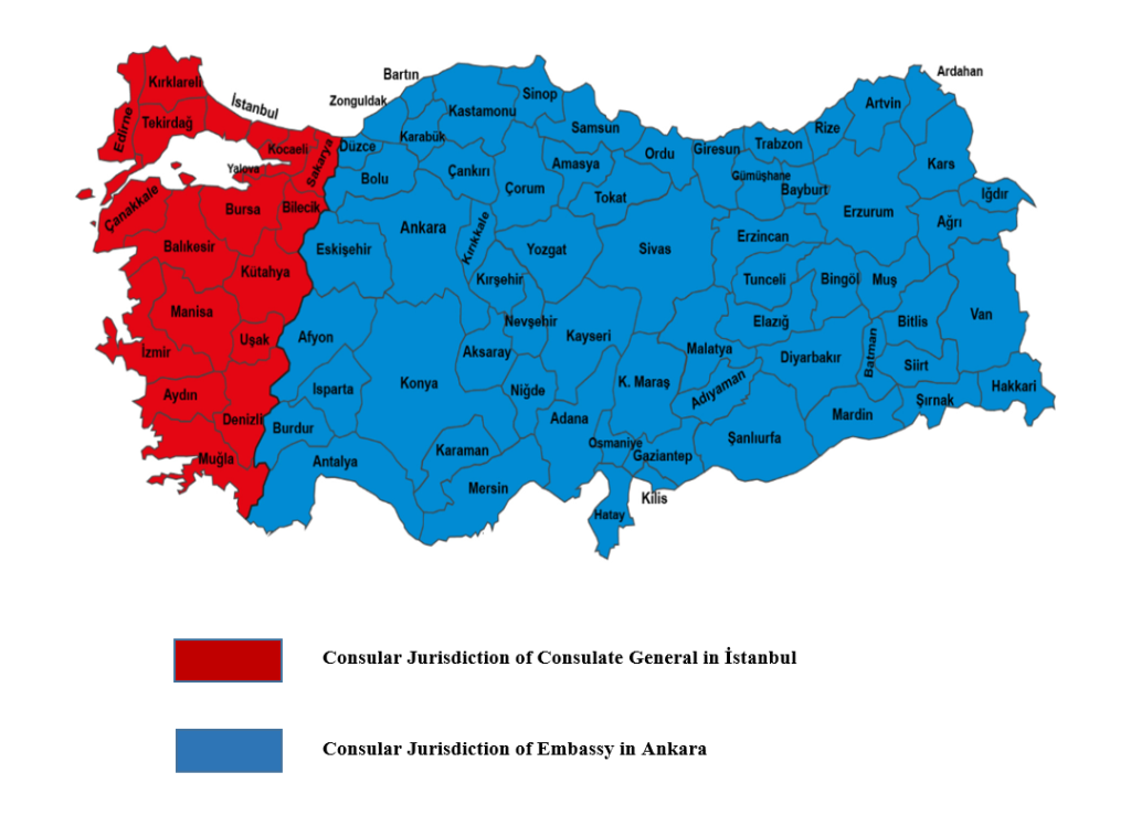 Istanbul Başkonsolosluğu , 1 Haziran 2023 tarihinden itibaren Aydın, Balıkesir, Bilecik, Bursa, Çanakkale, Denizli, Edirne, İstanbul, İzmir, Kırklareli, Kocaeli, Kütahya, Manisa, Muğla, Sakarya, Tekirdağ, Uşak ve Yalova illerinde konsolosluk yetkisini kullanmaktadır.